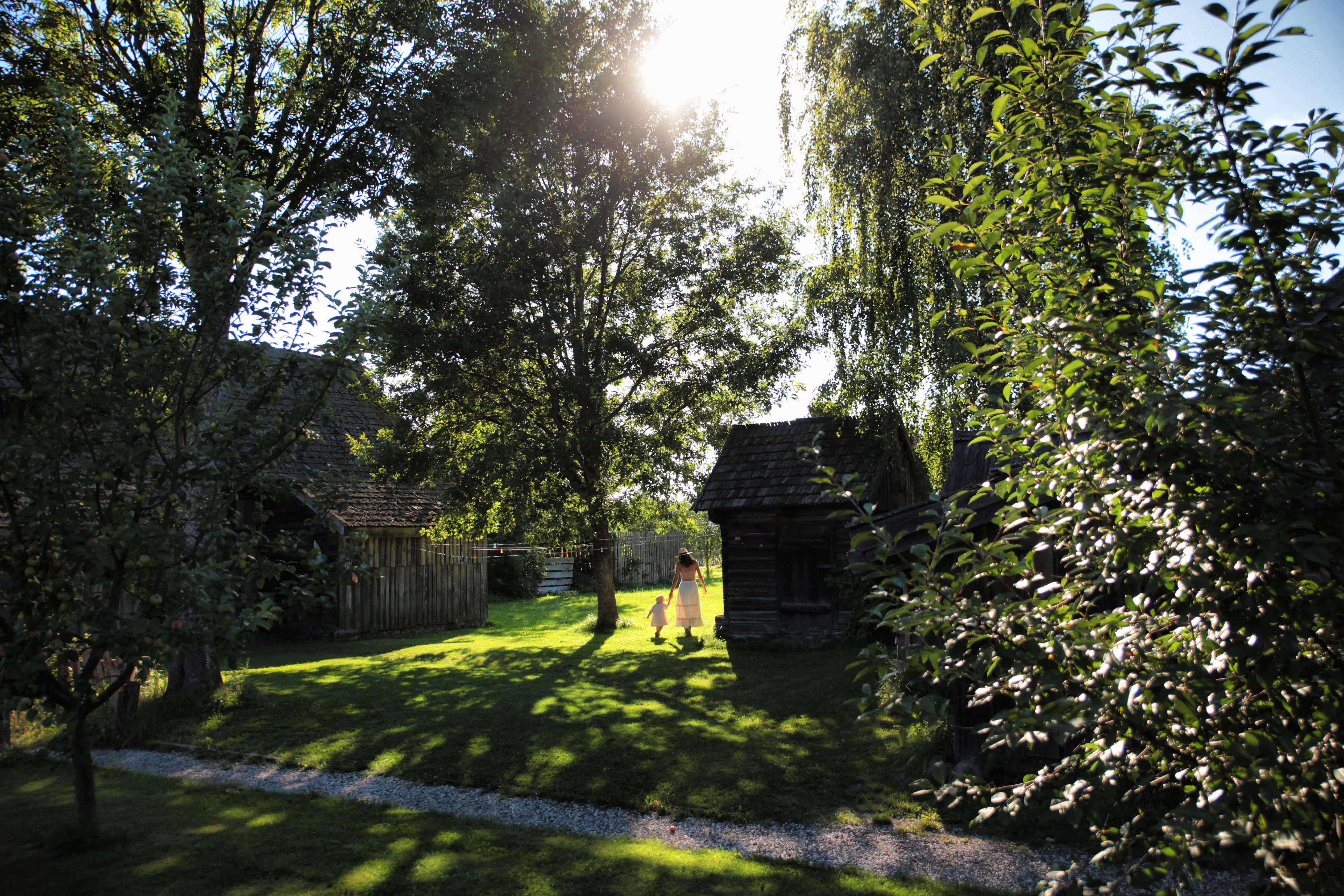 Po podwórzu biega pies, między drzewami suszy się pranie, a w ogródku posadzone są świeże owoce, warzywa i zioła.